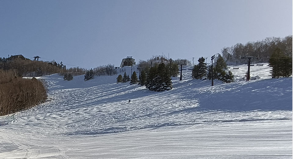 クワッドリフトを挟んで右側(スキー場下から見て)は中級コース、左側は上級コースとなっています。右側の中級コース(リフトを降りてスキーヤーズレフト)は基本的に圧雪されたワイドな中斜面です(時間やコンディションによっては一部コブ斜面になります)。中級コースといっても斜度がきつめであり、中級者がリラックスして滑れるコースとは言いにくく一定の覚悟が必要です。上級者にとっては高速カービングターンを思いっきり楽しめる非常に魅力的なコースであり、多くの上級スキーヤーが練習に励んでいる姿を目にします。
